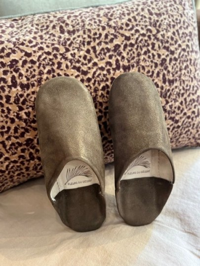 Éclatantes et raffinées, nos babouches artisanales en cuir et daim marron pailleté sont entièrement faites à la main par nos artisans marocains.