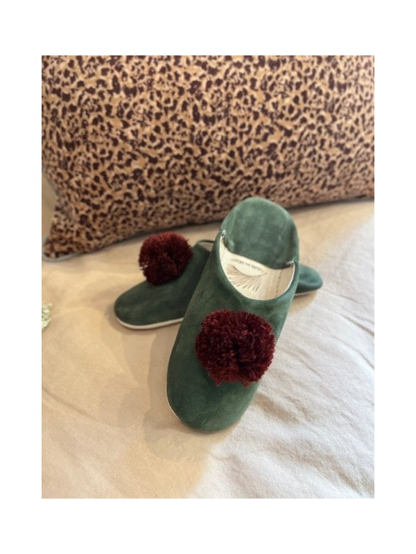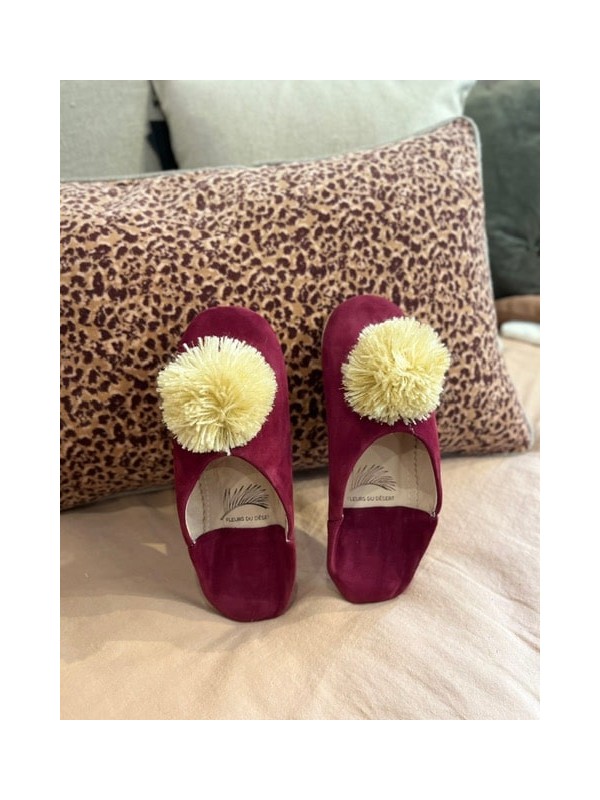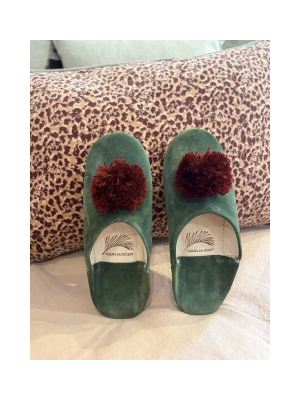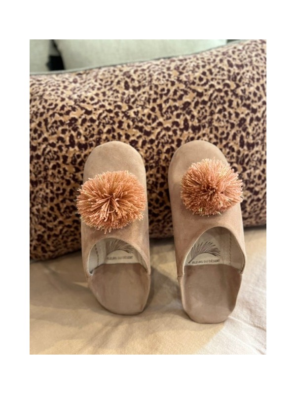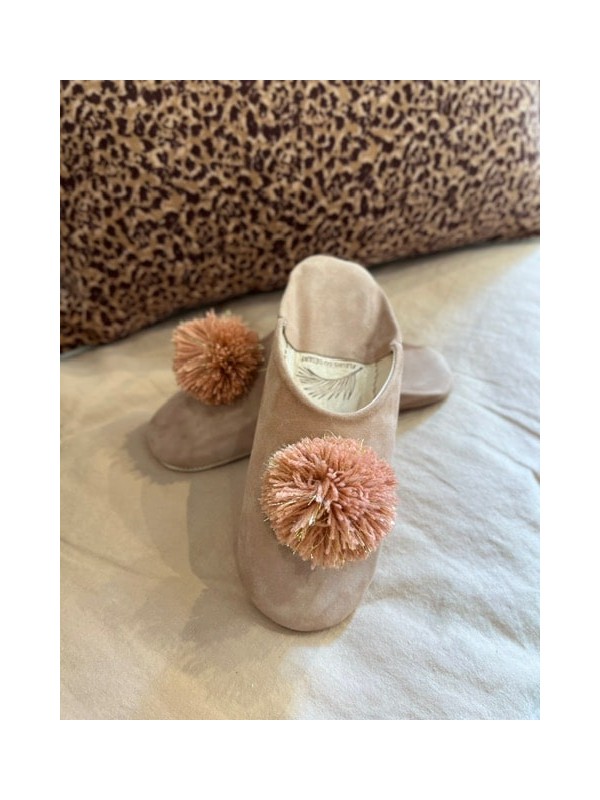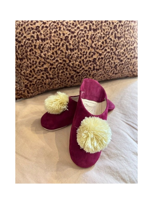 Élégantes et confortables, nos babouches en cuir et daim sont entièrement faites à la main par nos artisans marocains. Chaque paire est unique, ornée d’un pompon raffiné et disponible en plusieurs coloris :