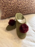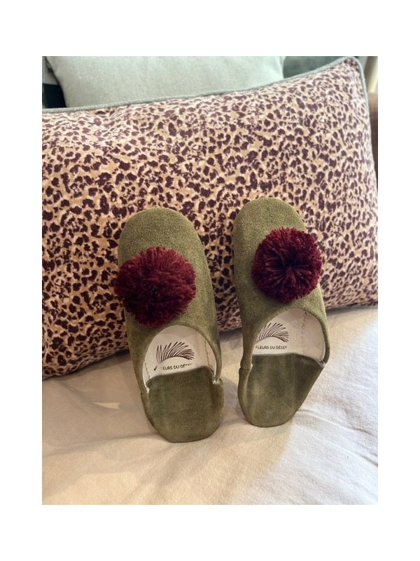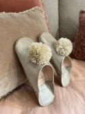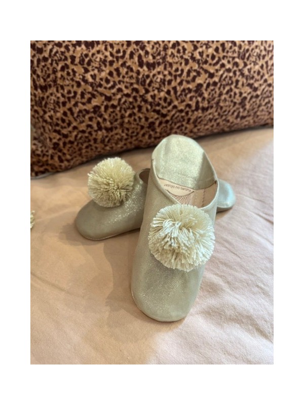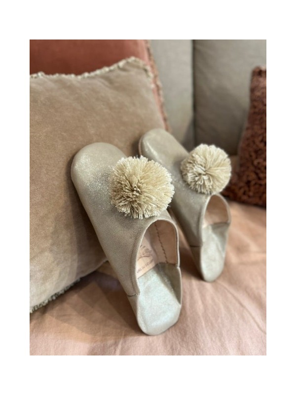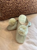 Ces babouches se distinguent par leur matière naturelle – cuir souple ou daim délicat – et leur pompon raffiné qui apporte une touche de chic et de modernité. Légères, confortables et durables.