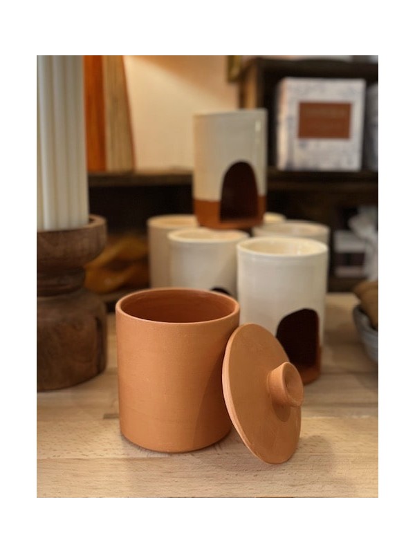 Apportez une touche de charme brut à votre intérieur avec ce pot en terre cuite avec couvercle, entièrement fabriqué à la main par notre artisan potier de Marrakech. Son design sobre et naturel en fait un objet aussi fonctionnel que décoratif, parfait pour conserver vos petits objets, épices, thés, herbes ou même des bijoux.