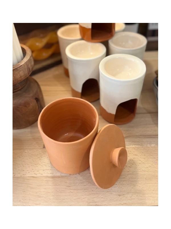 Pot en terre cuite avec couvercle, D9 x H11 cm, fait main à Marrakech. Parfait pour ranger épices, petits objets ou décorer votre intérieur naturellement.