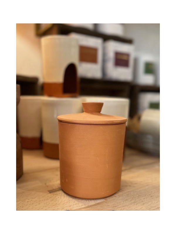Chaque pièce est façonnée selon des techniques traditionnelles, offrant un rendu unique, avec des irrégularités naturelles qui témoignent du travail manuel. Le couvercle bien ajusté protège le contenu, tout en accentuant le style rustique et authentique de l’objet.