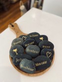 Galet tout doux avec différents messages gravés dessus.