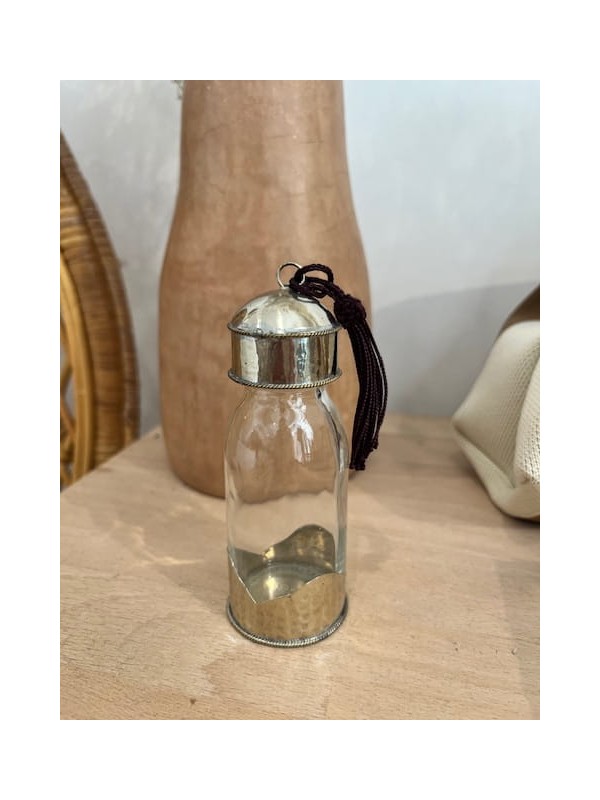 Ce flacon est délicatement cerclé de métal argenté finement ciselé, apportant une touche artisanale et raffinée. Son pompon en sabra, fibre végétale traditionnelle, renforce son charme authentique et exotique.